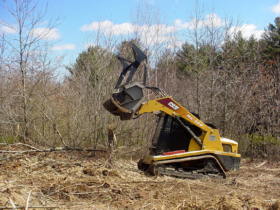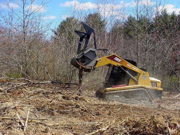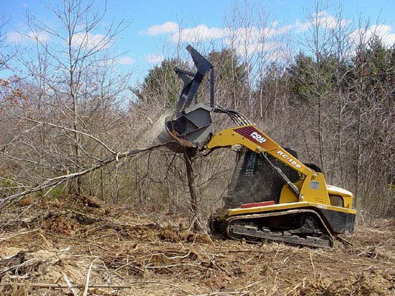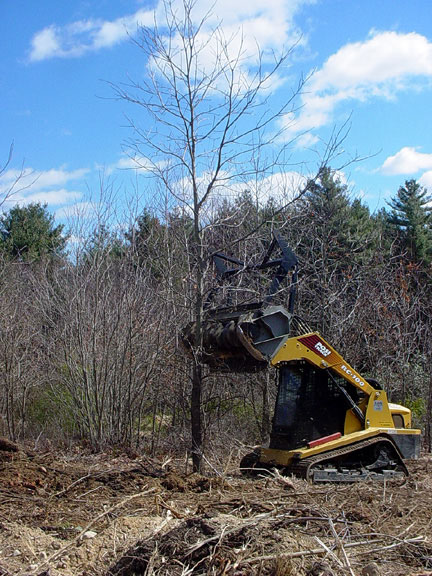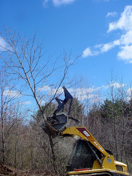 Twenty foot tall / eight inch diameter pin oak being mowed top to bottom.