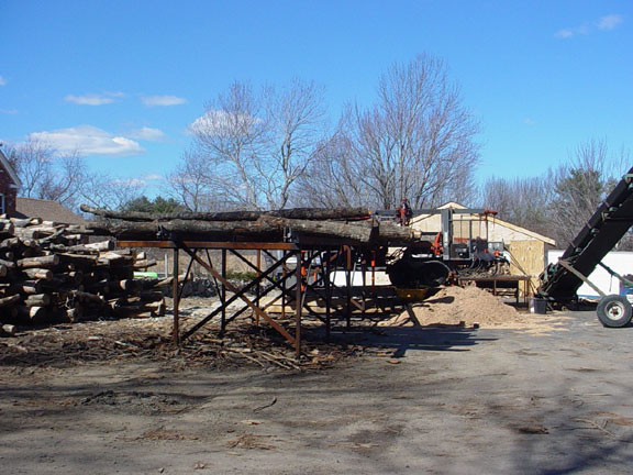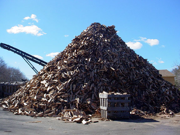 The good firewood travels up the conveyor belt to build a mountain of wood.