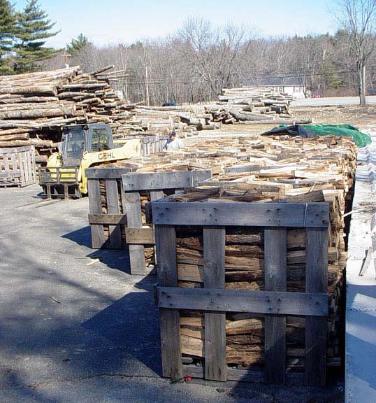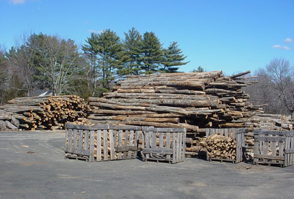 Various stages of dried logs in the yard, from full lengths awaiting processing, to cut and split logs in pallets.