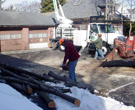 Small wood cut-up for firewood while raking cleanup progresses.