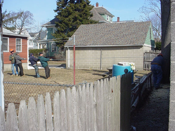 Tag line attached to 20" maple tree butt to control the lift away from garage.